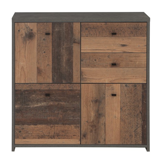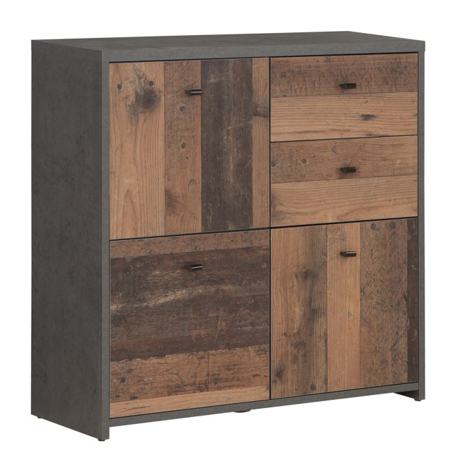 Szeroka na 77 cm komoda z tej kolekcji jest niezwykle funkcjonalna. Mebel ten wyposażony jest w trzy pojemne szafki oraz dwie szuflady. Komoda wykonana została w dekorze Beton Ciemnoszary oraz Old – Wood Vintage i jest idealna dla wielbicieli stylu industrialnego.