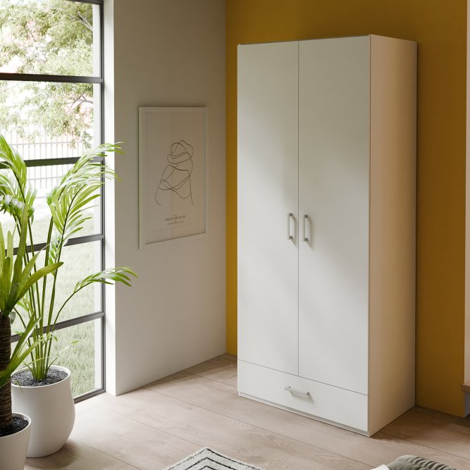 2-drzwiowa biała szafa z szufladą o szerokości niemal 90 cm z kolekcji EDYTA to idealne rozwiązanie dla osób poszukujących funkcjonalnych i estetycznych rozwiązań. Wnętrze mebla możesz dostosować do własnych potrzeb, dodając dedykowane półki. Szafa pozwala na łatwy dostęp do przechowywanych rzeczy, a dzięki uniwersalnemu kolorowi wpasuje się w każdą aranżację wnętrza.