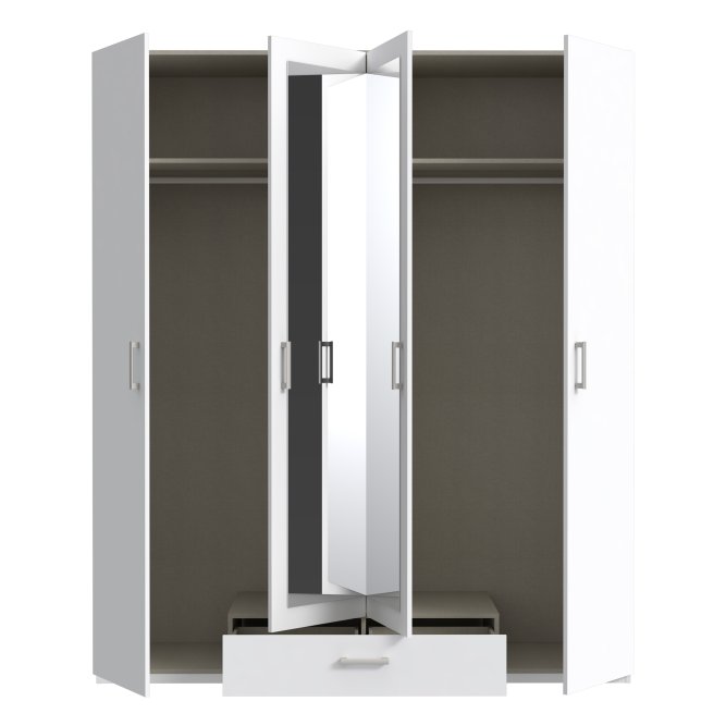 4-drzwiowa biała szafa uchylna z lustrem i szufladą o szerokości niemal 180 cm z kolekcji EDYTA to idealne rozwiązanie dla osób poszukujących funkcjonalnych i estetycznych rozwiązań do swojej garderoby. Wnętrze mebla możesz spersonalizować, dodając dedykowane półki. Szafa pozwala na łatwy dostęp do przechowywanych rzeczy, a dzięki uniwersalnemu kolorowi wpasuje się w każdą aranżację wnętrza.
