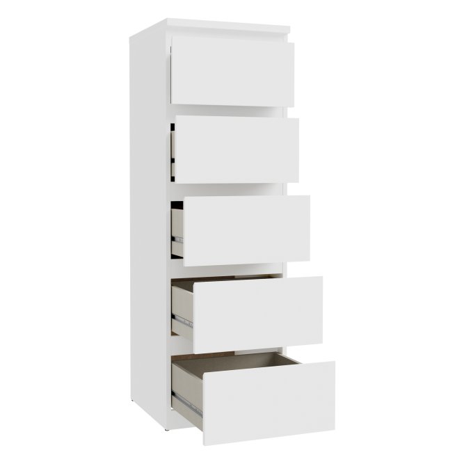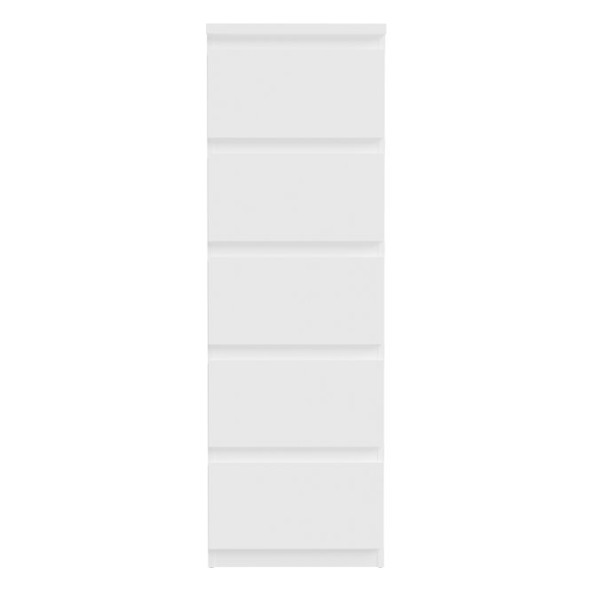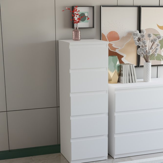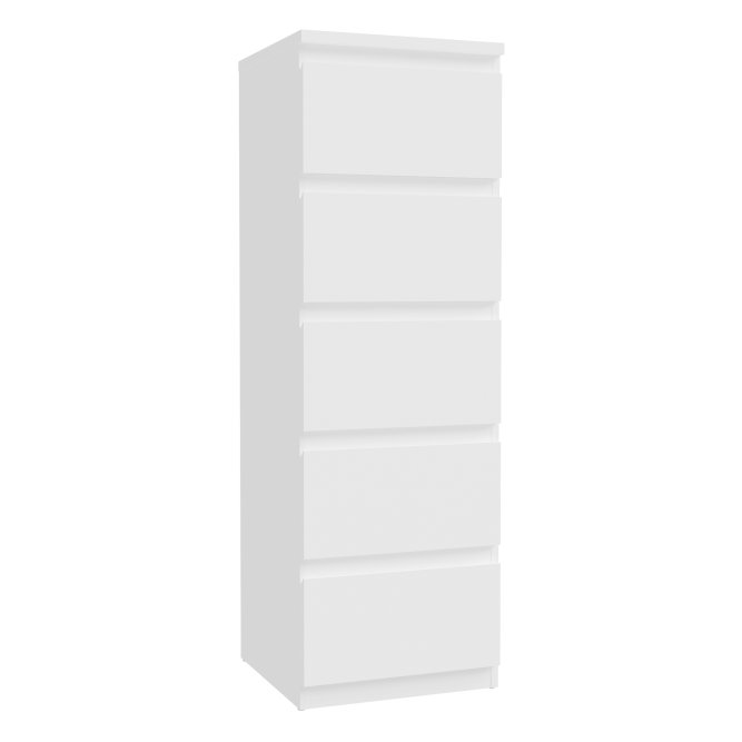Wysoka, biała komoda z 5 szufladami w formie smukłego słupka to praktyczne rozwiązanie dla tych, którzy chcą maksymalnie wykorzystać przestrzeń w pomieszczeniu. Dzięki pionowej konstrukcji mebel zajmuje niewiele miejsca, jednocześnie oferując dużo przestrzeni do przechowywania.