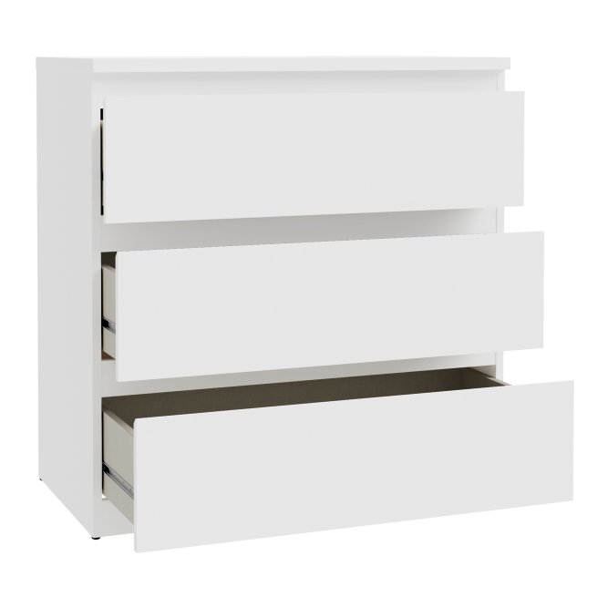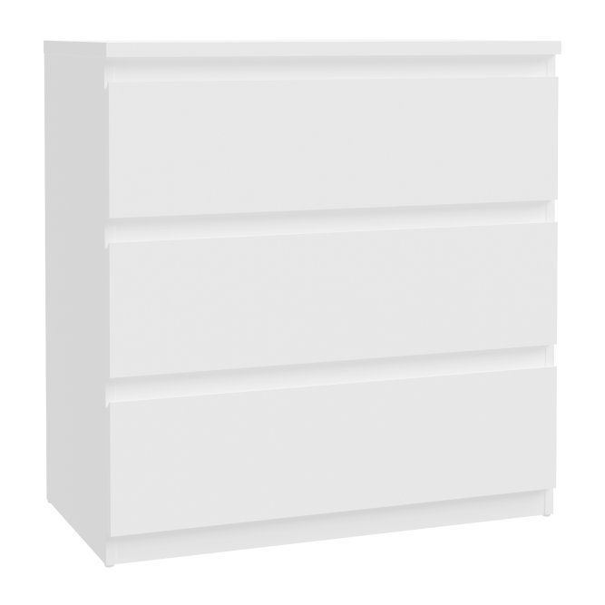 Biała komoda z 3 szufladami to funkcjonalny mebel, który sprawdzi się w wielu pomieszczeniach, takich jak sypialnia, salon, domowe biuro, czy przedpokój. Trzy pojemne szuflady zapewniają dużo miejsca do przechowywania odzieży, akcesoriów, czy dokumentów, pomagając w utrzymaniu porządku.