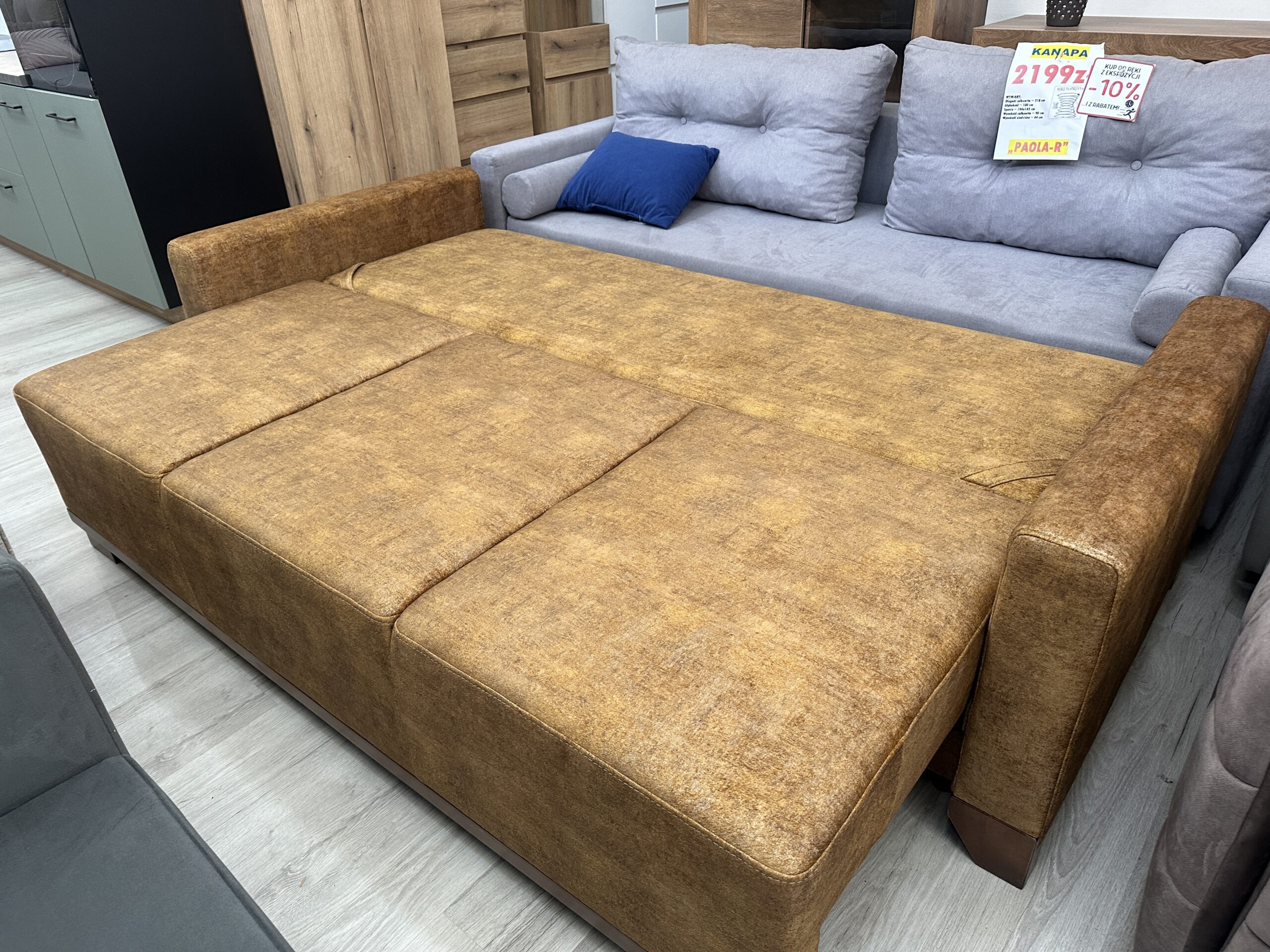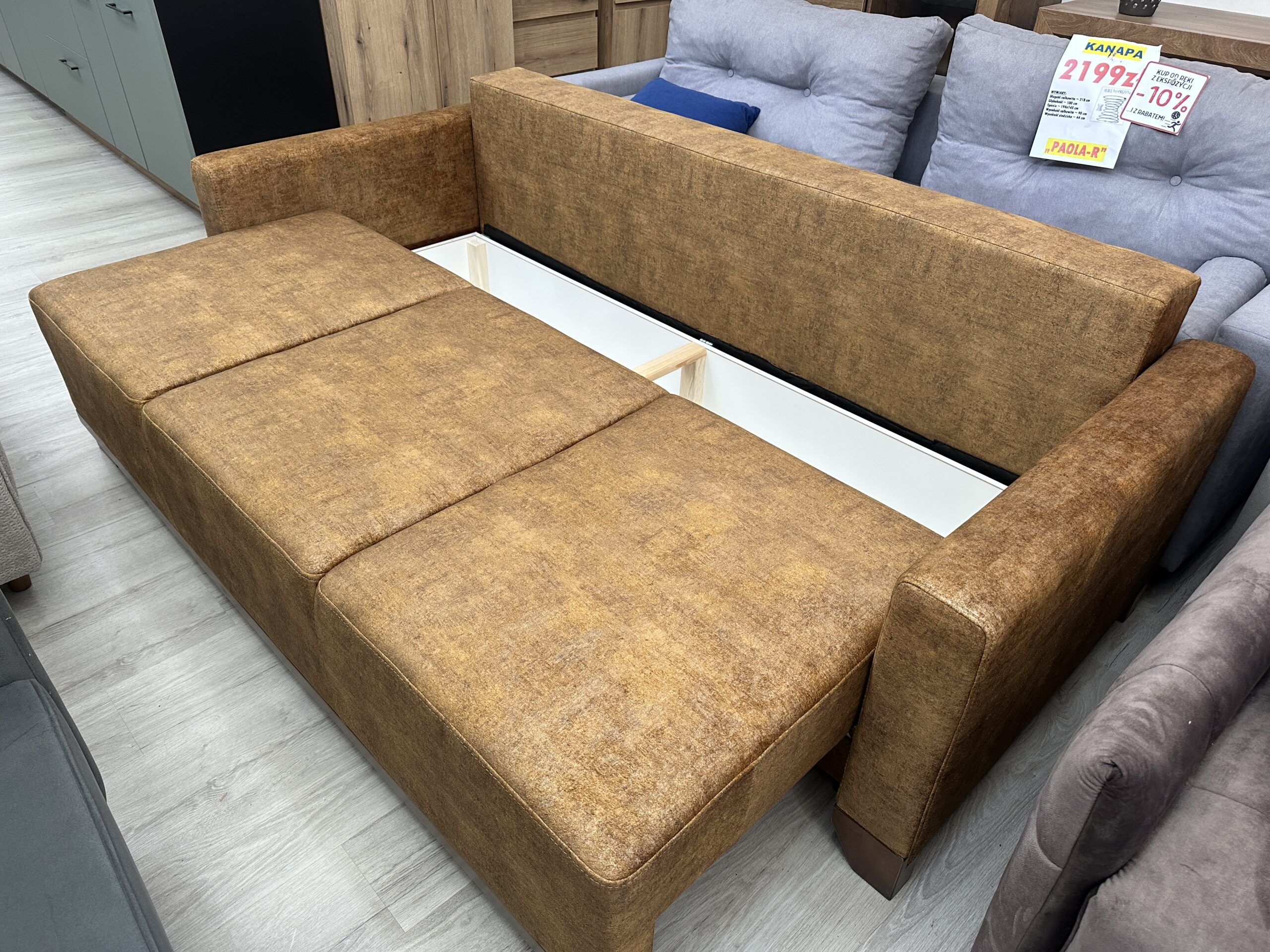 Kanapa KOMFORT z funkcją spania oraz z dużym i łatwo dostępnym pojemnikiem na pościel. Wystarczy zdjąć poduszki, aby następnie za pomocą jednej ręki rozłożyć automatycznie siedzisko.
