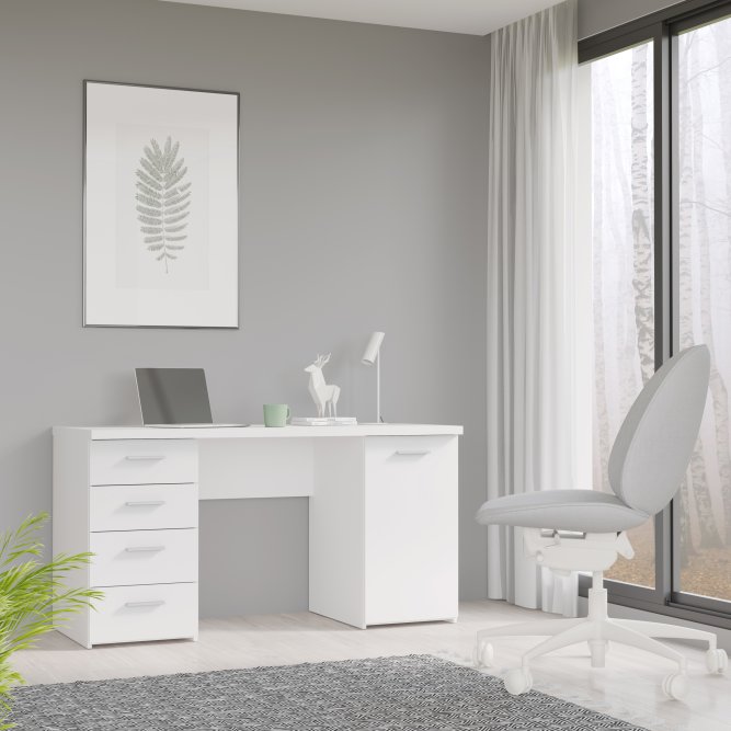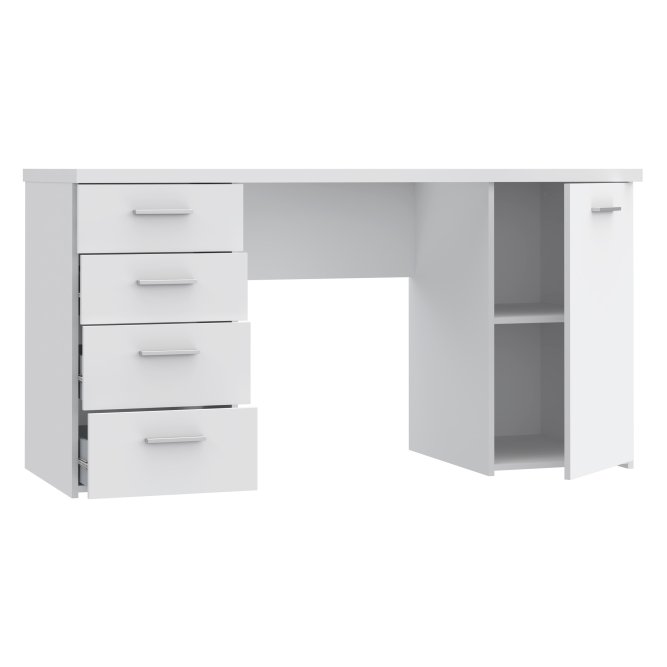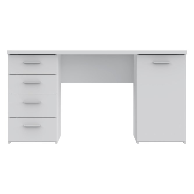 Klasyczne biurko w nowoczesnym stylu doskonale sprawdzi się w stylowym wnętrzu domowego gabinetu oraz pokoju młodzieżowego. Wykonane w dekorze Biały Uni Mat z uchwytami w kolorze aluminium doskonale sprawdzi się w każdej aranżacji wnętrza.